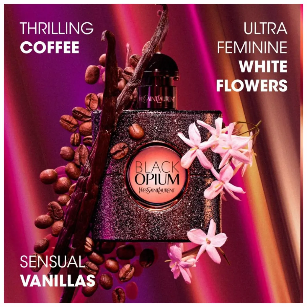 At the heart of Black Opium is an addictive black coffee accord blended with luminous white flowers, the ultimate play of shadow and light. A gourmet dose of vanilla envelops the fragrance in celestial beauty, creating a trail that is indulgent, sensuous and absolutely unforgettable.