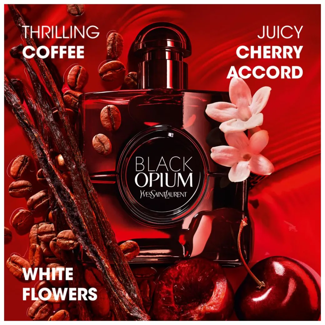 - Black Opium Eau de Parfum Over Red: A thrilling temptation, the signature coffee and vanilla notes of Black Opium Eau de Parfum are twisted with a juicy red cherry accord. Sweet and seductive.