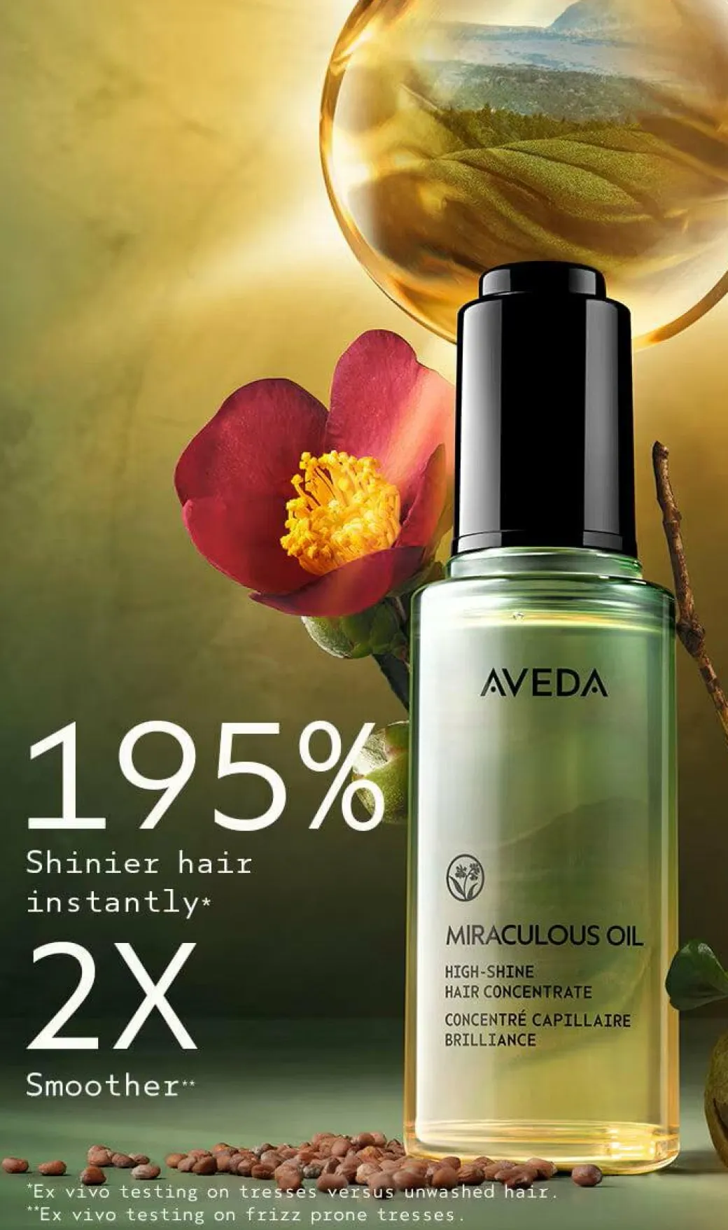 Aveda Miraculous Oil High Shine is a precious concentrate that effortlessly wraps hair in light-reflecting shine and immerses your senses in a calming pure-fume aroma. Discover a blend of traditions in every drop. Infused with Tsubaki seed oil, harvested in part from Jeju Island and daikon seed oil, responsibly sourced from cooperative farms in Willamette Valley, Oregon. This precious concentrate delivers 195% more shine, instantly and creates smoother hair, while immersing your senses in a calming pure-fume aroma.