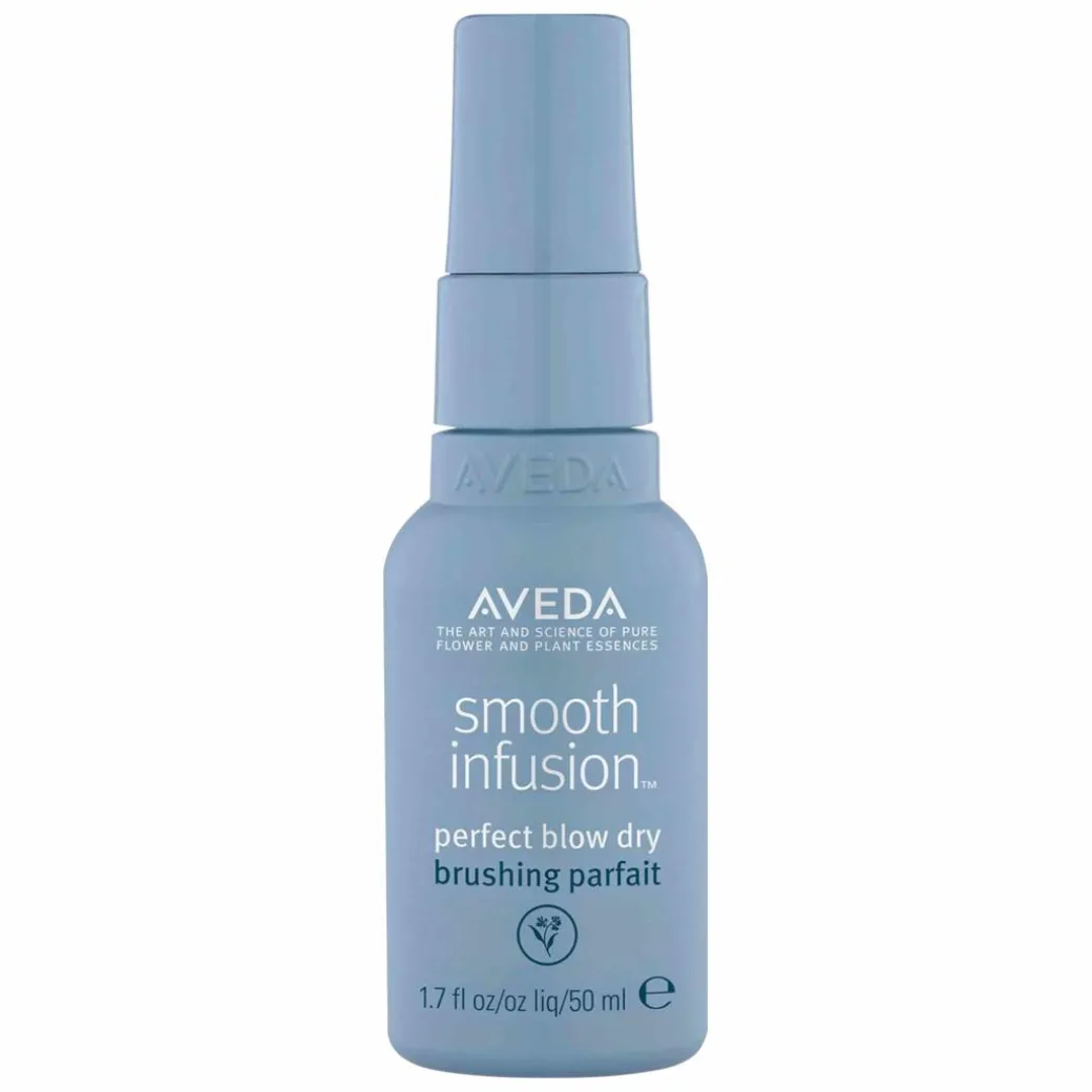 The Aveda Smooth Infusion Perfect Blow Dry is designed to protect frizz-prone hair from heat styling up to 230 degrees. The Blow Dry Spray coats every hair strand, smoothing the hair cuticle to be shiny and frizz-free. The smoothing technology is activated when heat is applied to your hair as you blow dry and style. The Blow Dry formula also protects hair against the drying effects of the sun with UV filter technology.