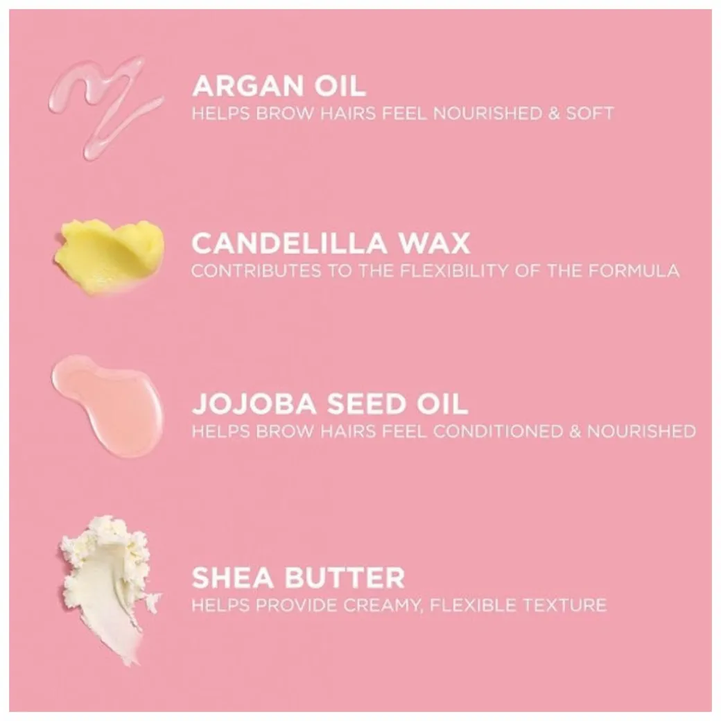 It conditions and nourishes brow hairs with jojoba seed oil. Its flexible, playable and non-crunchy formula is soft and moveable because of shea butter and argan oil.