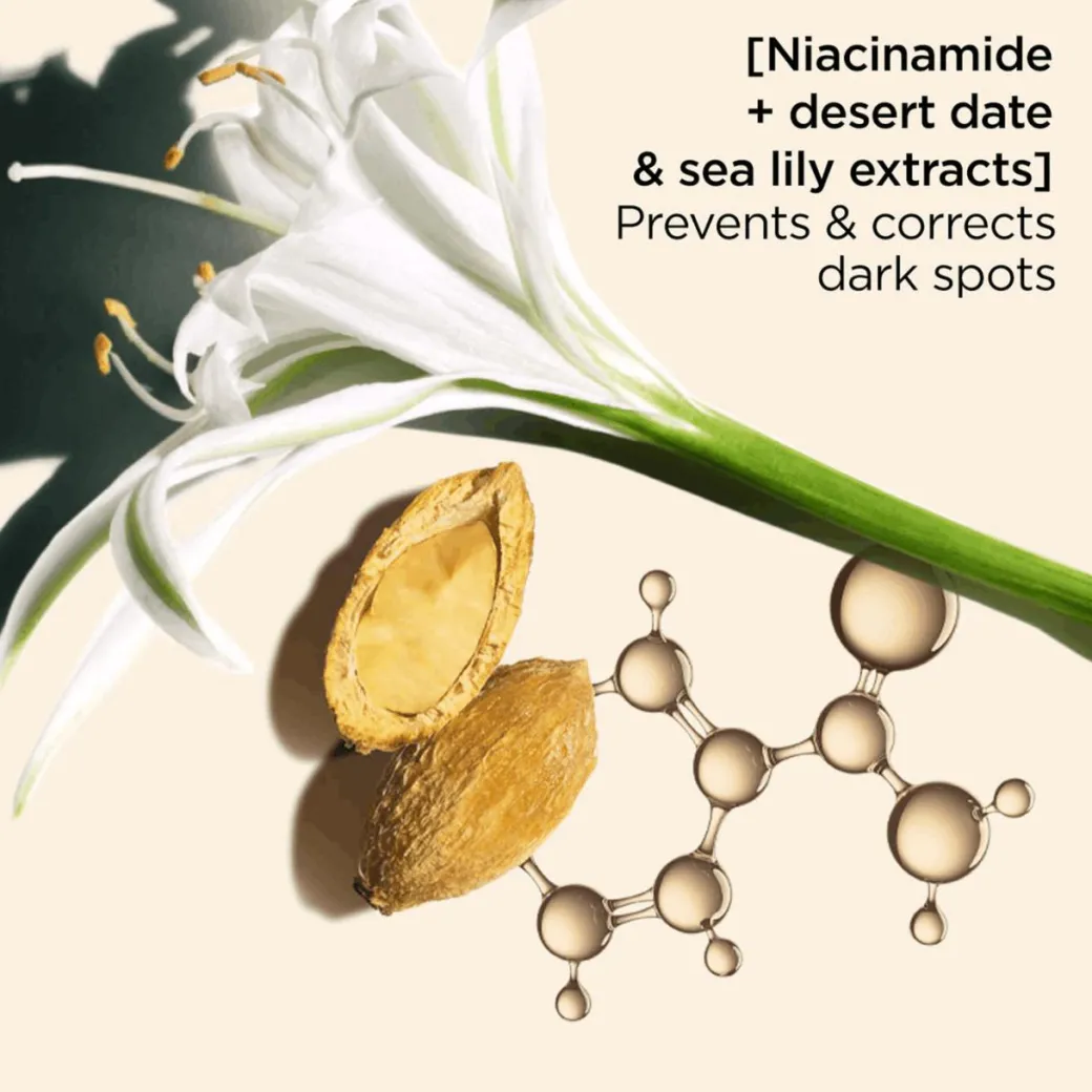 To create the [BRIGHTENING COMPLEX], Clarins Laboratories selected two active ingredients from plants and one leading molecule: Organic desert date extract helps to prevent the appearance of new dark spots. Organic sea lily extract and niacinamide help to reduce the appearance of dark spots and contribute to a brighter, more even complexion.