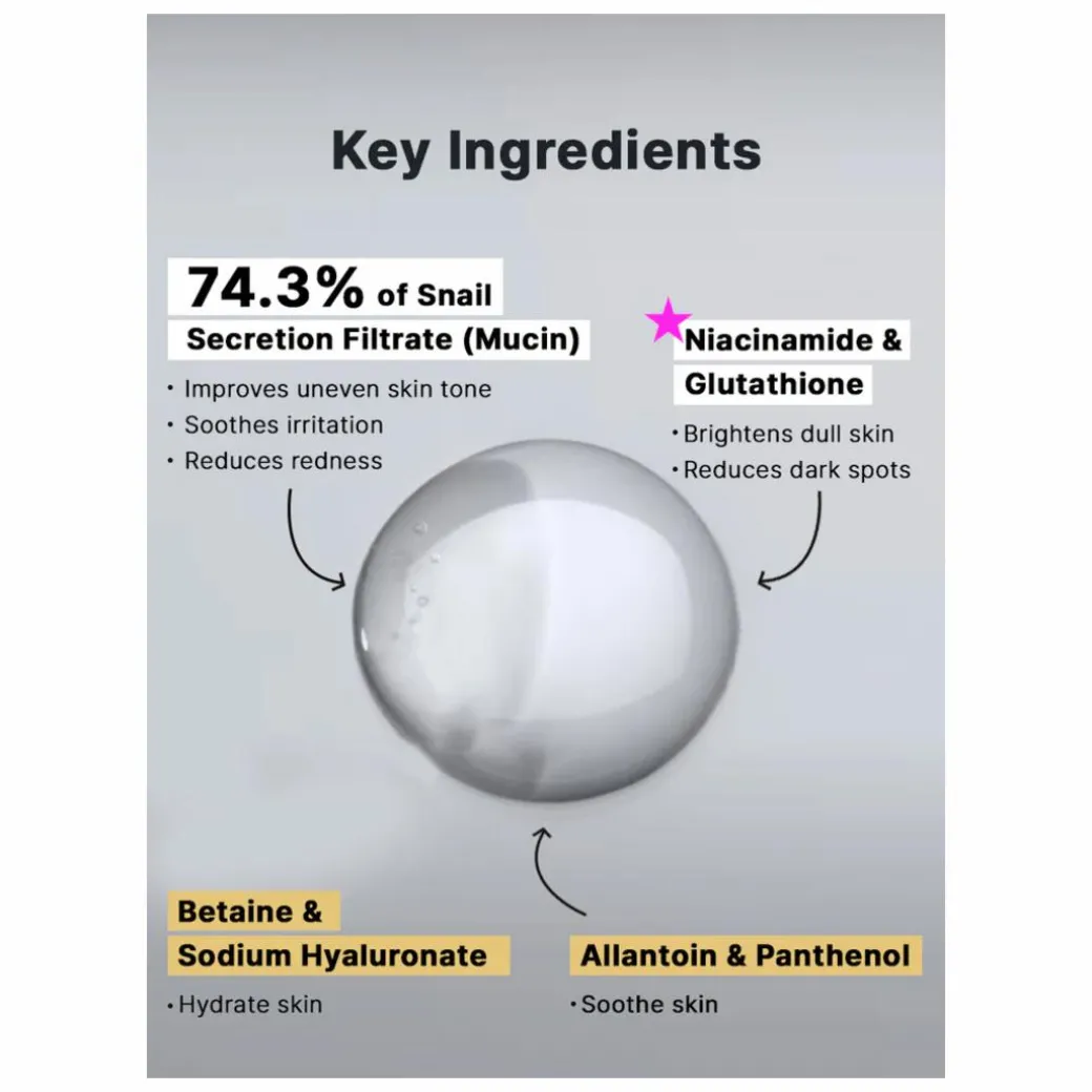 Snail Secretion Filtrate, Butylene Glycol, Niacinamide, 1,2-Hexanediol, Betaine, Panthenol, Water, Glycerin, Limnanthes Alba (Meadowfoam) Seed Oil, Helianthus Annuus (Sunflower) Seed Oil, Allantoin, Carbomer, Macadamia Ternifolia Seed Oil, Sodium Polyacrylate, Sodium Hyaluronate, Inulin Lauryl Carbamate, Arginine, Argania Spinosa Kernel Oil, Xanthan Gum, Soidum Surfactin, Ethylhexylglycerin, Glutathione