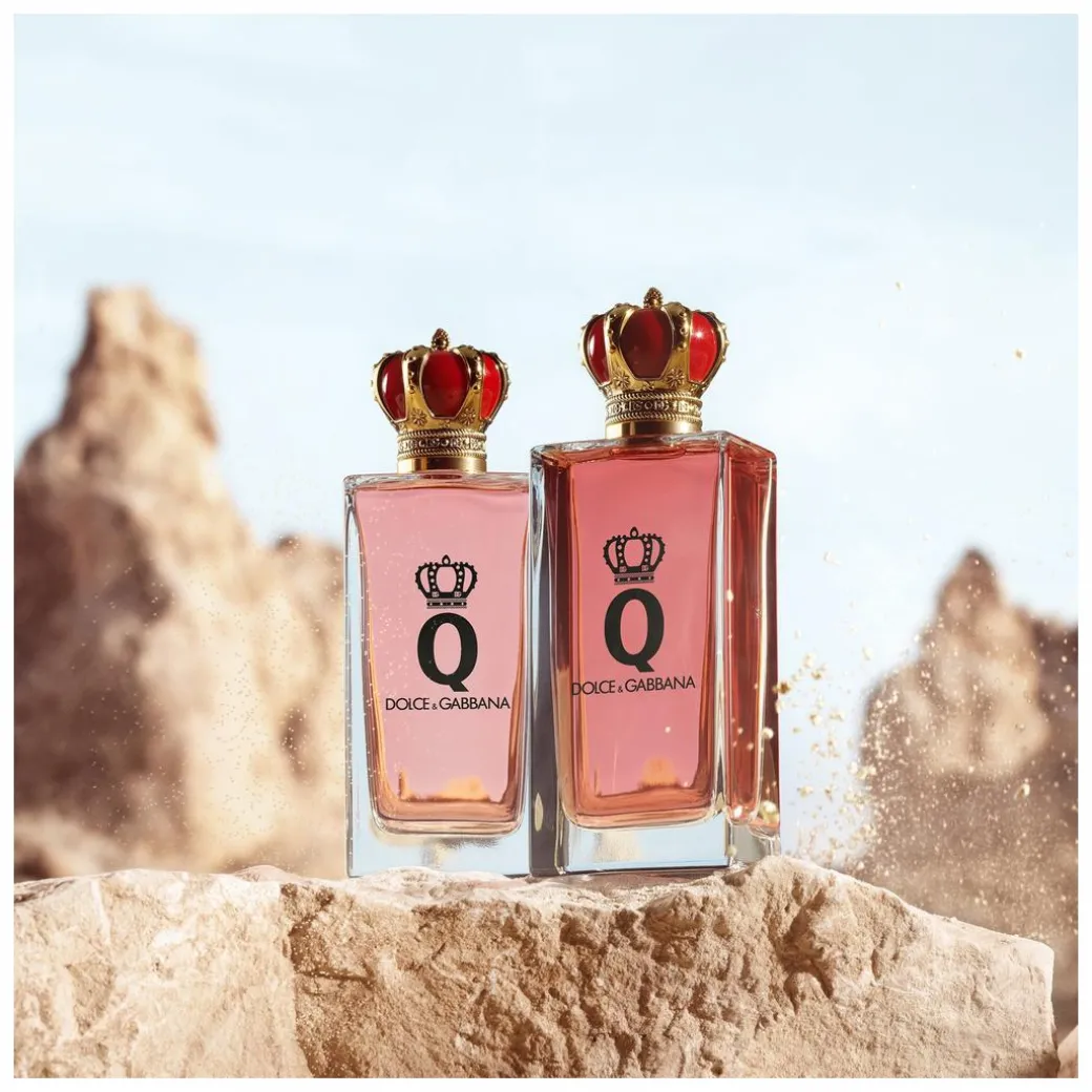 The bottle of the new fragrance echoes the original Q by Dolce&Gabbana, both in the cap, which depicts a regal gold and red crown, and on the glass that holds the essence of bold cherry hue.