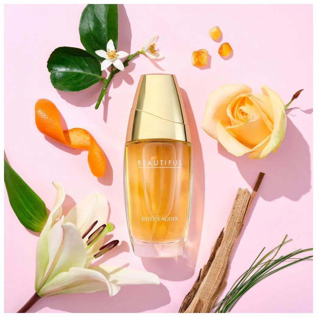 If you love floral notes, you get more than your fair share here. Beautiful EDP starts off with a rich blend of romantic rose, honeyed tuberose and sweet lily, balanced by slightly green marigold and sparkling mandarin fruit. The heart introduces a heady, opulent white floral tone to add to Estee Lauder’s bridal bouquet-like fragrance. Then, Beautiful warms through with milky sandalwood, dry, smoky vetiver and warm, resinous amber.