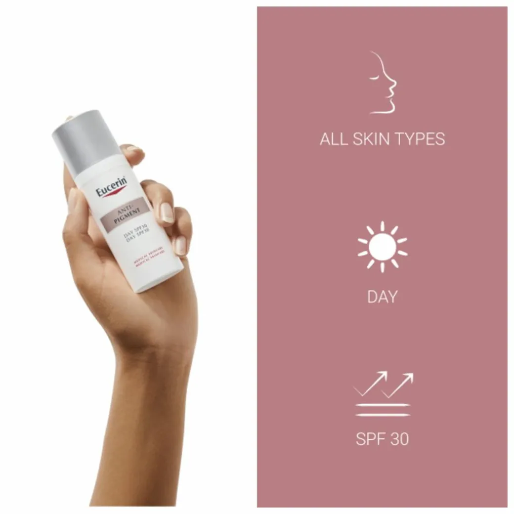 Achieve an even, radiant complexion with the Eucerin Anti-Pigment Day Cream, a daily moisturiser for all skin types, which offers SPF30 broad-spectrum protection while minimising hyperpigmentation.