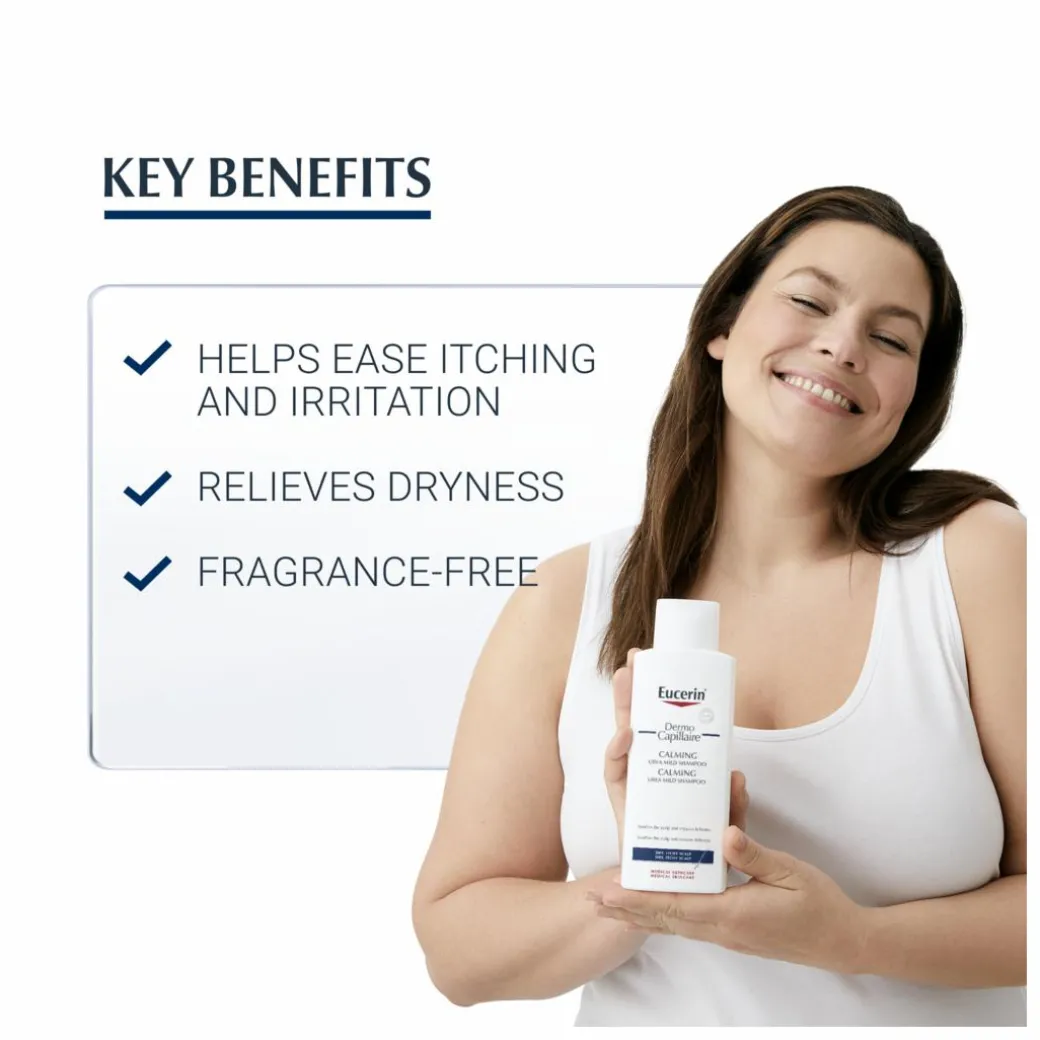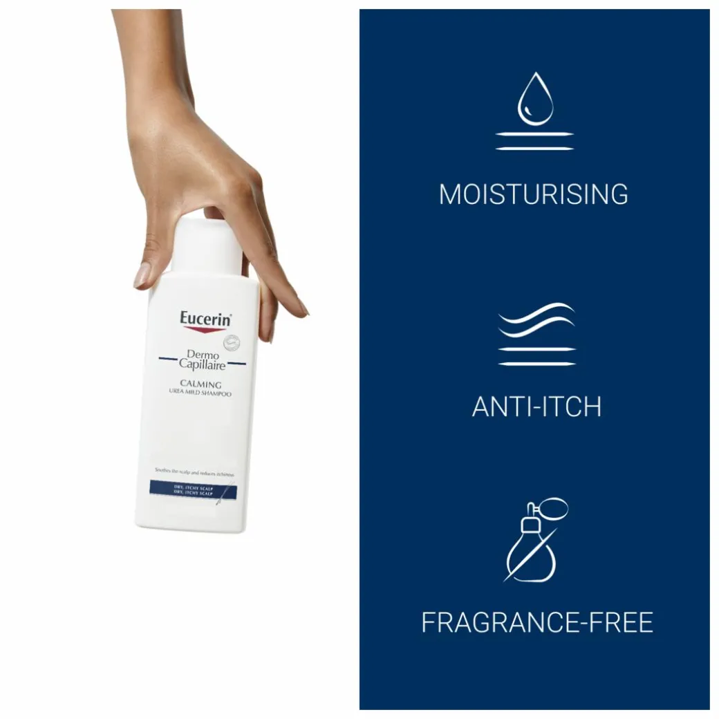 Gently wash your hair and soothe your scalp with the Eucerin DermoCapillaire Calming Urea Shampoo – 5% Urea, a hair wash designed for dry, itchy scalps.