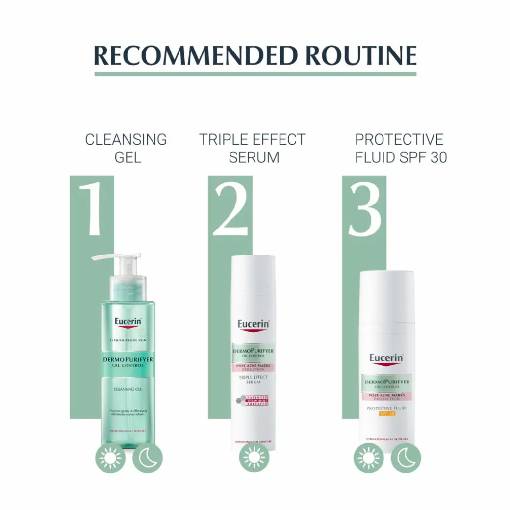 Eucerin’s DermoPurifyer sunscreen can be used as often as needed. We recommend applying one full pump to cleansed skin, working your way out from the centre and taking care to avoid the eye area.
