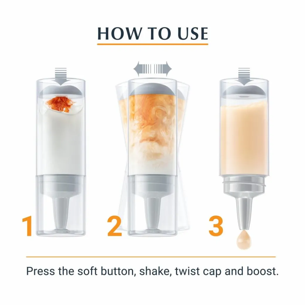 At the base of the serum, peel off the protective foil but leave the cap on. Press the button at the base two to three times to release the vitamin C. Shake the dispenser for at least 10 seconds to activate. Remove the cap at the top by twisting it, and press the button at the base to release the formula onto the tip of a finger before applying it to skin.