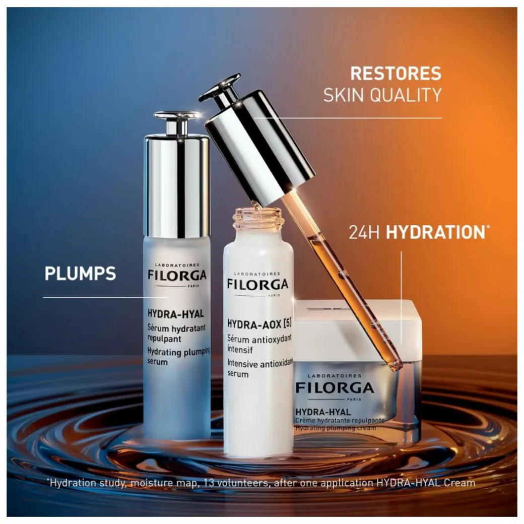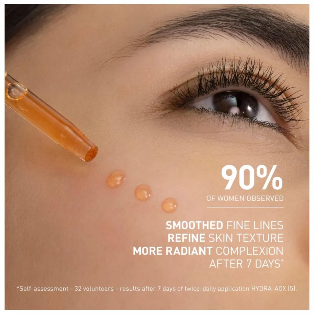 Filorga Hydra-Aox [5] Intensive Antioxidant Serum corrects and prevents early signs of ageing while protecting the skin against external aggressors (pollution and blue light), to act on the 5 parameters of skin quality: fine lines, uneven skin texture, pores, dull complexion and dehydration. Younger-looking skin for longer.