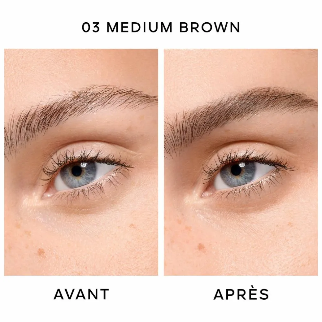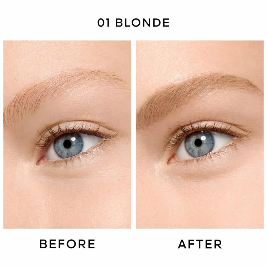 For naturally defined eyebrows, draw micro-strokes in the direction of hair growth with the fine tip of Brow G, then brush them on to blend the material and mimic the natural texture of eyebrows.