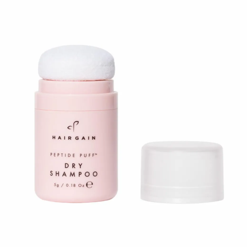 The Hair Gain Peptide Puff Dry Shampoo is a finely milled dry shampoo for all hair types. Unlike many other dry shampoos, the Peptide Puff comes in a non-aerosol format; it has a sustainable, padded puff applicator that’s dabbed directly onto the hair.