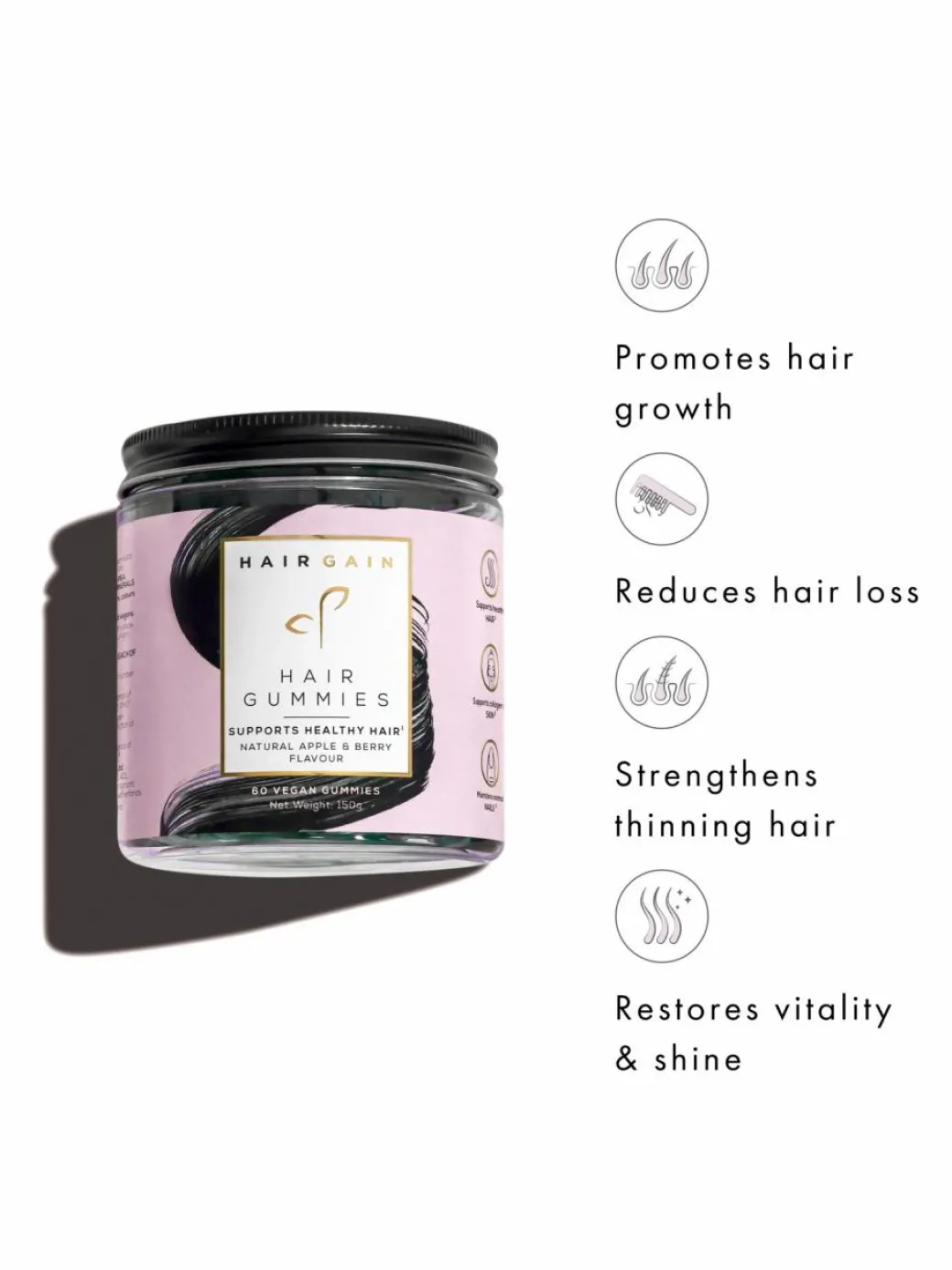 Note: Do not exceed the recommended daily dose. Gummies are to be chewed and not swallowed whole. Food supplements are not a substitute for a varied diet and healthy lifestyle. It’s not recommended to use the Hair Gain Capsules and the Hair Gain Gummies – choose one or the other. If you are pregnant, breastfeeding, have a medical condition, are taking any prescription medications or are under medical supervision, please consult your doctor before taking this product.