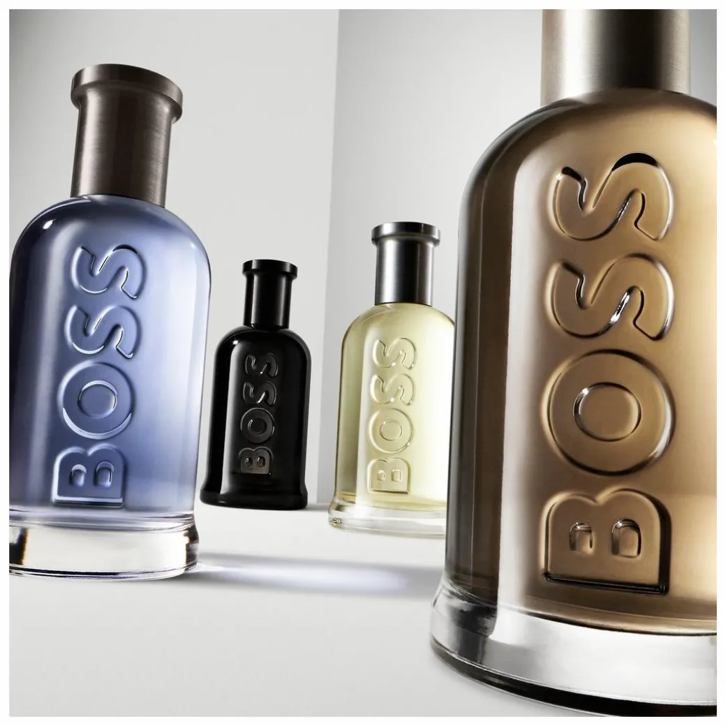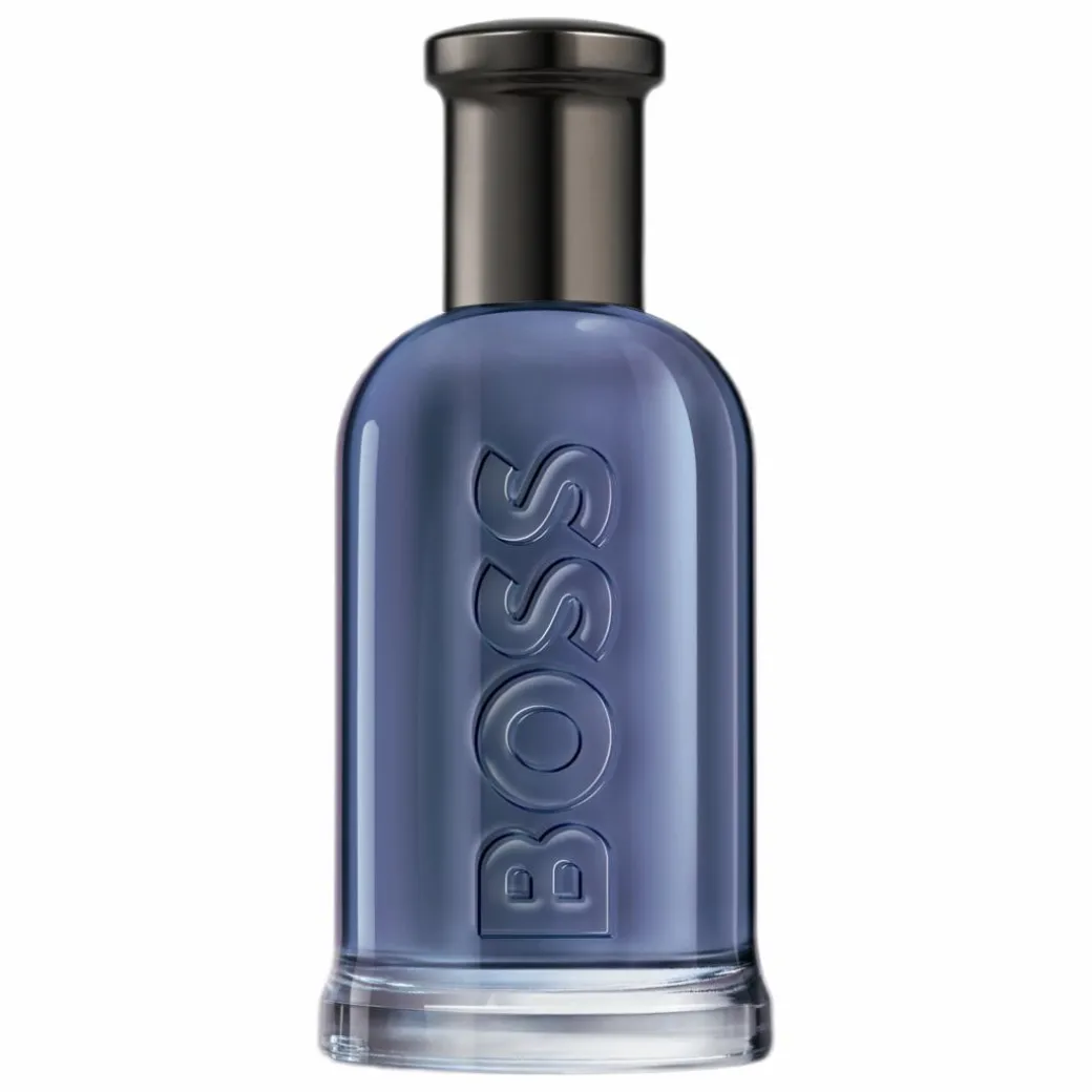 - Iconic HUGO BOSS glass bottle with deep blue tones and a gunmetal top.