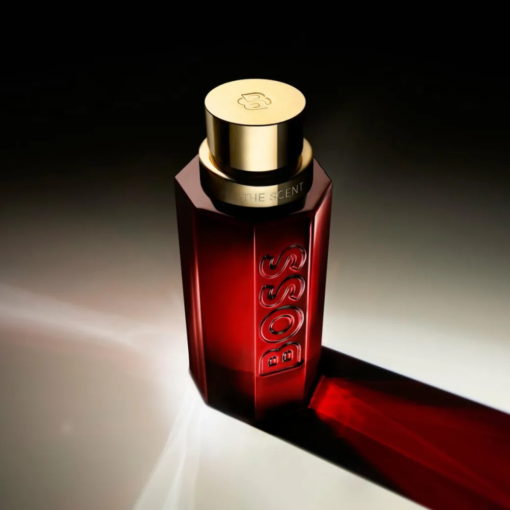 The iconic BOSS The Scent bottle is dressed in the same deep-red lacquered glass as its feminine counterpart, reflecting the intensity of the seductive scent within. The bottle is topped with a warm-gold cap featuring a luxurious satin finish, mirroring the gleaming metallic accents on the outer packaging.