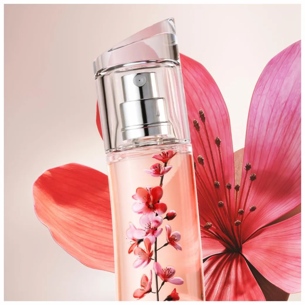 The Ikebana bottle boasts a new cherry blossom design featuring fully recyclable materials, sustainable inks, and a distinct flute-shaped glass design. Reflecting Kenzo’s commitment to sustainability, the packaging uses organically sourced inks.