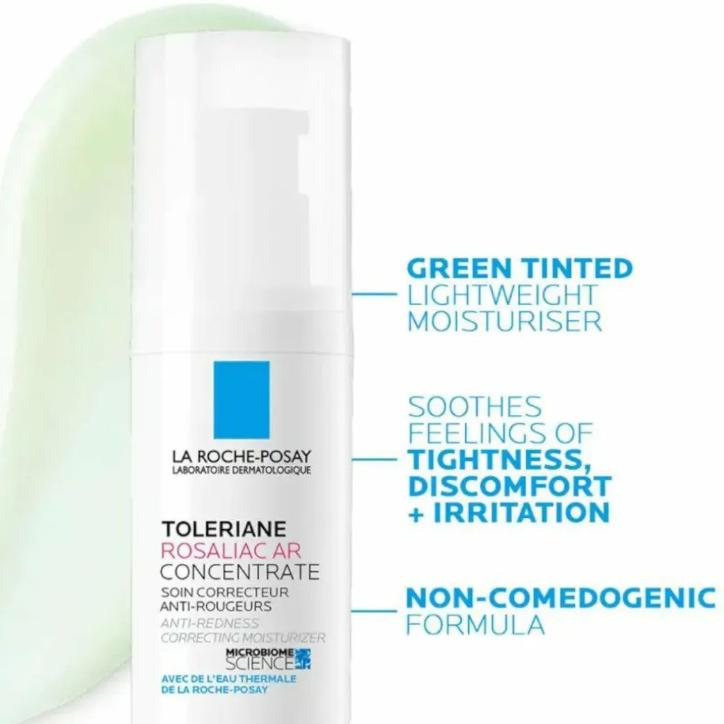 La Roche-Posay Toleriane Rosaliac AR concentrate is a green tinted lightweight face moisturiser that is clinically proven to instantly hydrate skin. Soothes skin and helps neutralise redness on the skin.