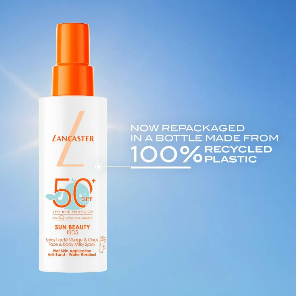 Lancaster’s sunscreen for kids is held in a spray bottle that comprises at least 50% post-consumer recycled plastic, while the outer box is made from responsibly-sourced paper.