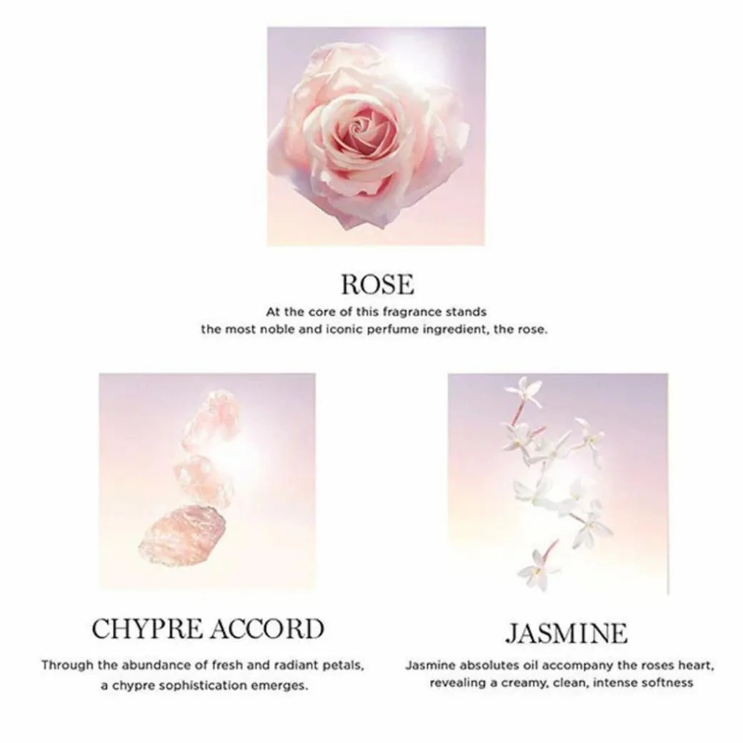 Middle Notes: Rose Essence, Rose Absolute, Rose Water, Jasmine Infusion, Jasmine
