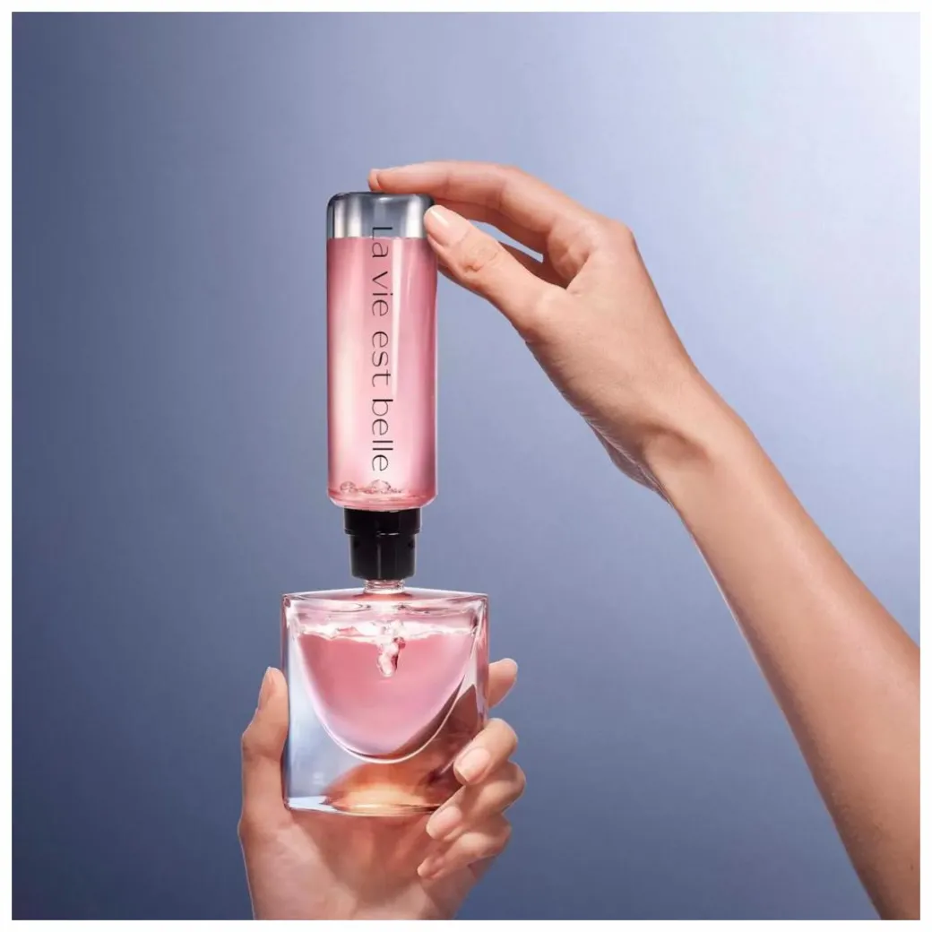 Remove the cap on your original La Vie Est Belle glass bottle, ensuring it is the refillable design bought in 2022 or later (this is made clear on the box). Remove the pump and replace it with the refill, holding it upside down. Turn the refill to the left to start refilling and back to the right to close the refill again. Replace the original spray and cap, and use your original bottle as normal.