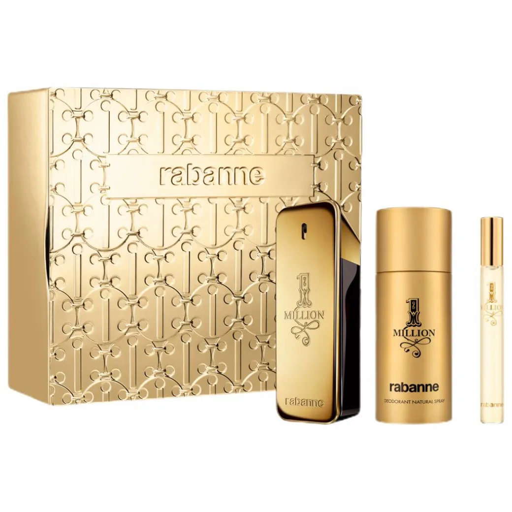 Indulge the man in your life with the bold, rich scent of Rabanne 1 Million with the Eau de Toilette Gift Set, a fragrance trio that’s infused with the spicy-leather scent of 1 Million.