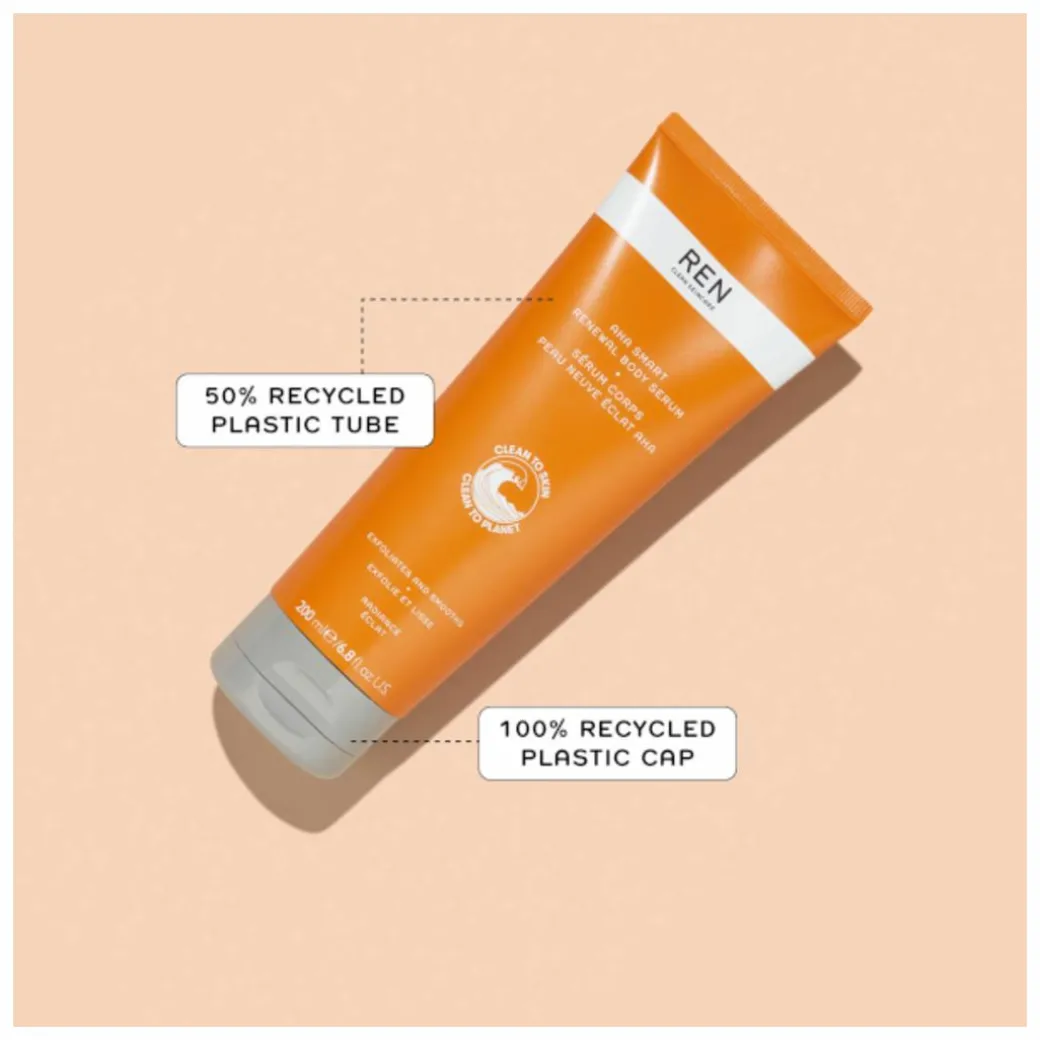 The REN AHA Smart Renewal Body Serum is housed within a tube made from 50% post-consumer recycled plastic, while the cap is made from 100% post-consumer recycled plastic – both are recyclable.