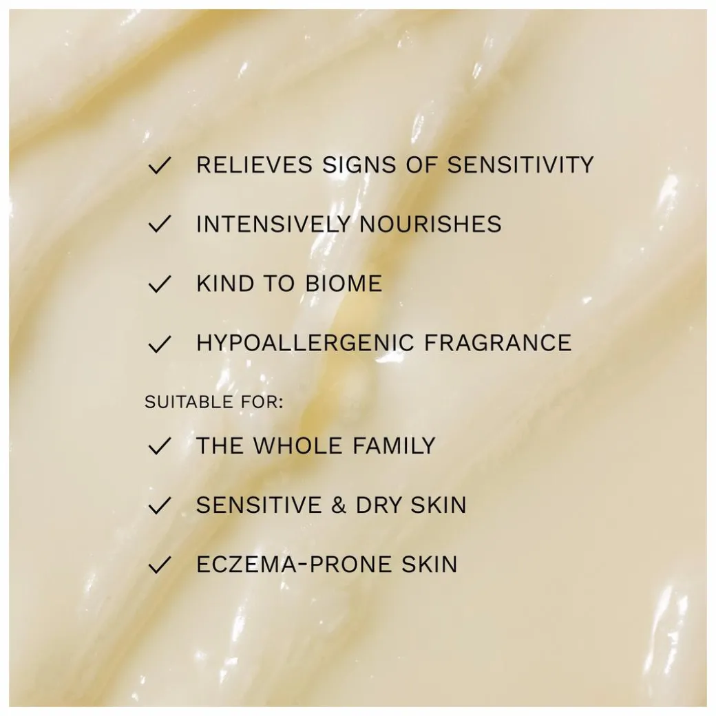 - A balm-to-oil formula that nourishes very dry to eczema-prone and problematic skin.