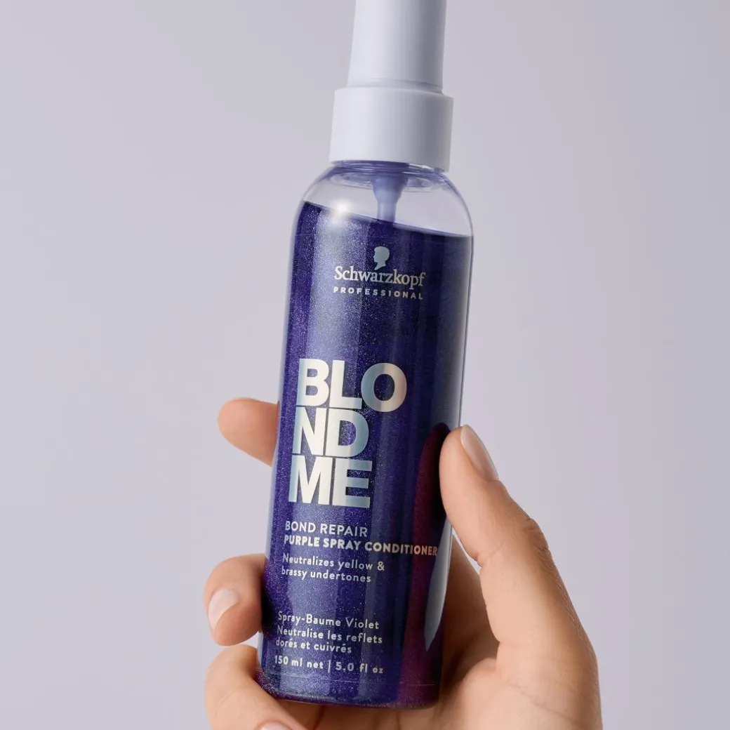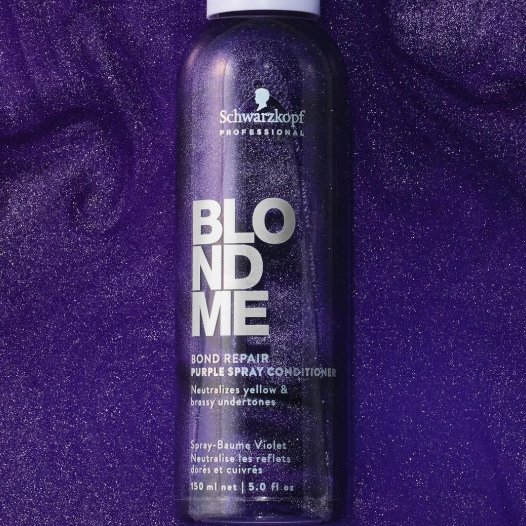 Neutralising yellow undertones and helping to prevent brassiness, BlondMe Bond Repair Purple Spray Conditioner with BOND REPAIR TECHNOLOGY instantly detangles the hair and provides a beautiful, silver shine. The formula, enriched with Almond Oil and Cornflower, delivers targeted levels of cool pigments to maintain a fresh cool tone direction for improved blonde clarity, without changing the hair colour. Restoring radiance and shine, it strengthens the hair by building inner hair bonds, repairing damage equivalent to two lightening services after just one use.