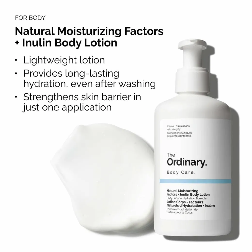 The Ordinary Natural Moisturising Factors + Inulin Body Lotion is a lightweight body moisturiser for all skin types formulated to keep skin hydrated, even after washing. The lotion-textured formulation provides instant and all day hydration, and strengthens the skin barrier after one application.