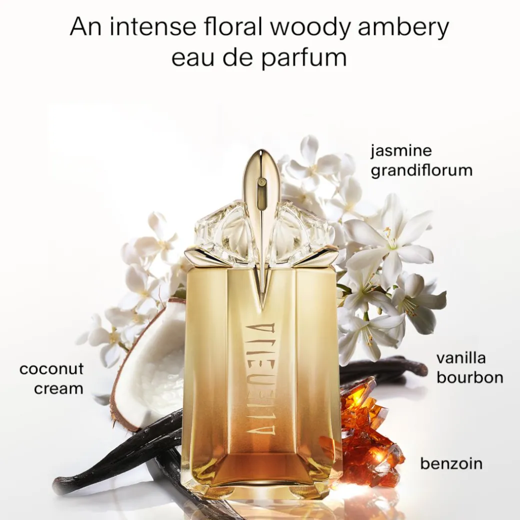 Vibrant tropical fruits meet sweet jasmine, creamy vanilla and woody benzoin in Alien Goddess Intense. Opening with zesty bergamot and a delectable coconut accord, the top notes are bright and vibrant but have a smooth creaminess lingering beneath the surface. The heart is powered by white florals: Alien Goddess’ signature Superinfusion of Jasmine Grandiflorum is joined by jasmine tea, leaving an opulent white floral trail as the scent dries. The base has a dazzling sweetness, making the scent feel both solar and gourmand as it has a rich, creamy and woody dry down. The vanilla creates a cosy sweetness that isn’t overwhelming, given Mugler’s elegant twist of cashmere and a woody hit of benzoin.