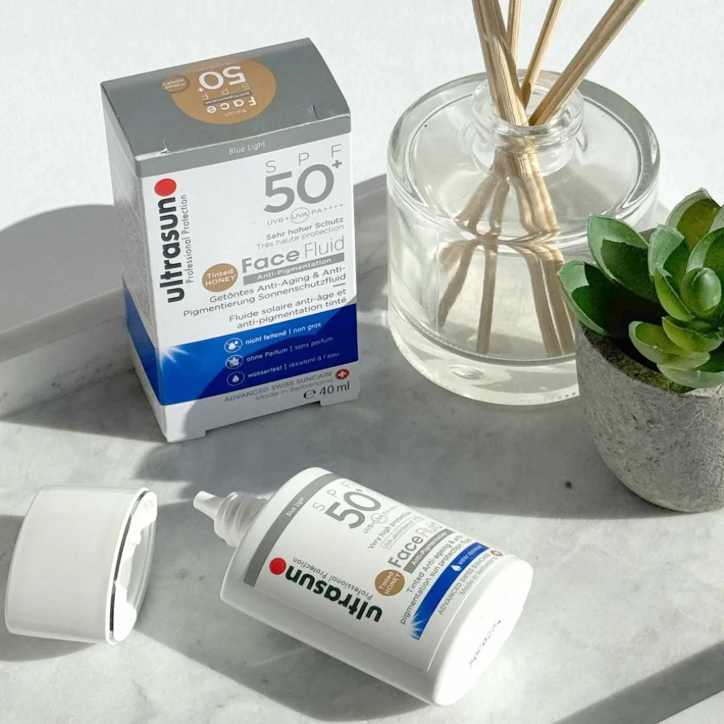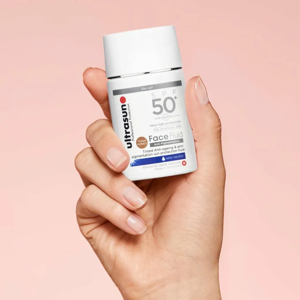 - Ultrasun Face Fluid Anti-Pigmentation Tinted SPF50+ can be applied as part of your daily skincare regime. Cleanse, tone, Ultrasun.