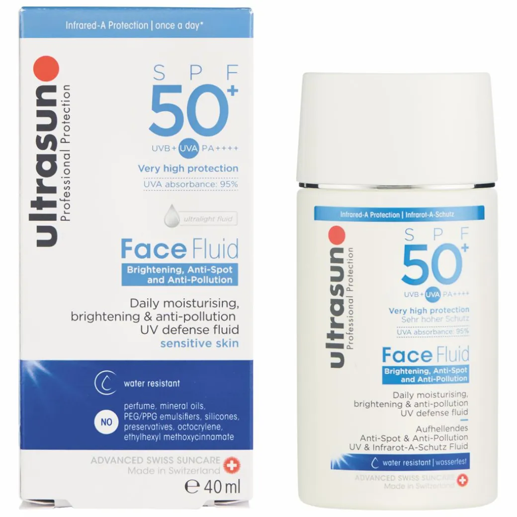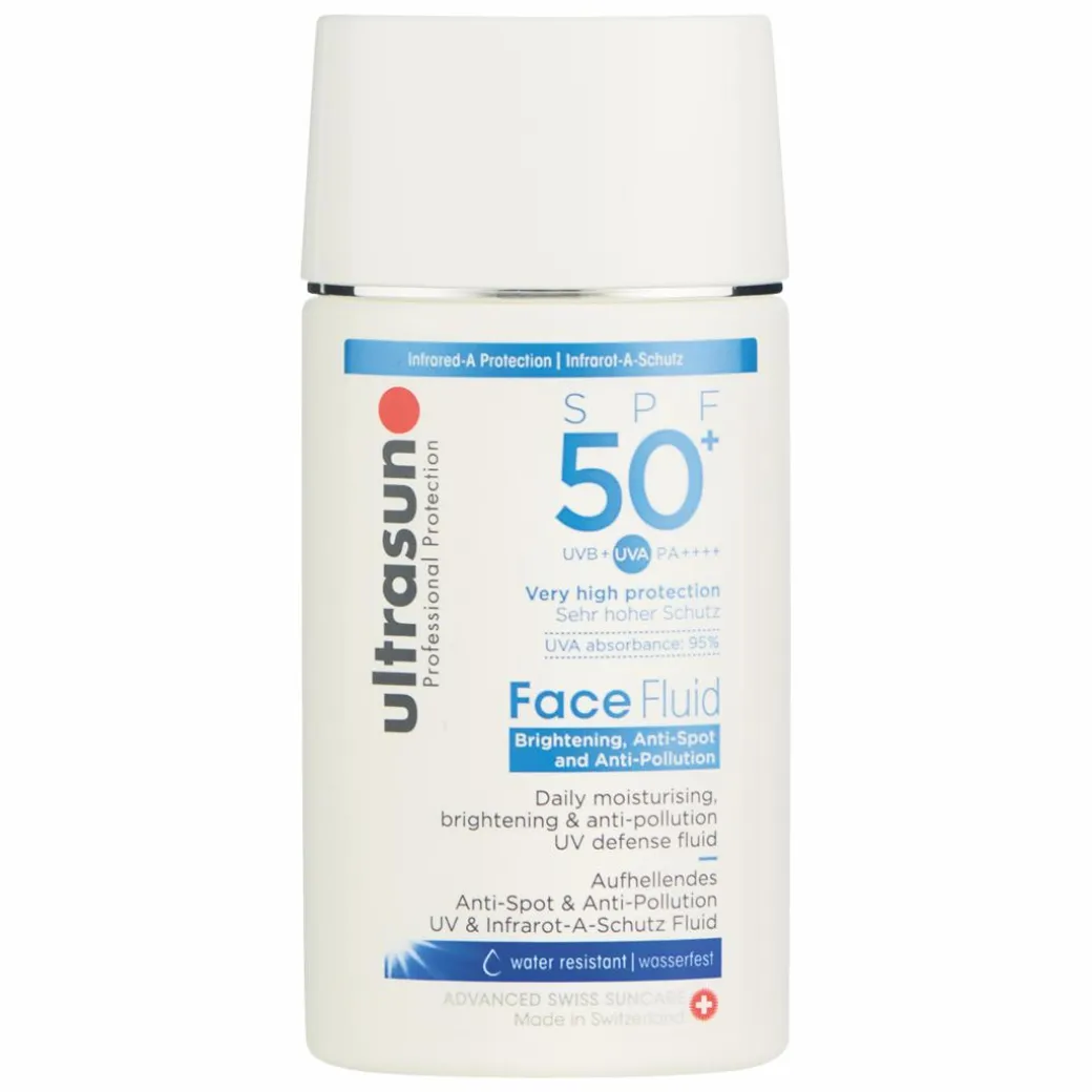 Keep your complexion protected from UV rays, pollution and dullness with the Ultrasun Face Fluid Brightening, Anti-Spot and Anti-Pollution SPF 50+, a chemical daily SPF 50 moisturiser for all skin types – including sensitive – that enhances radiance while shielding against the sun.