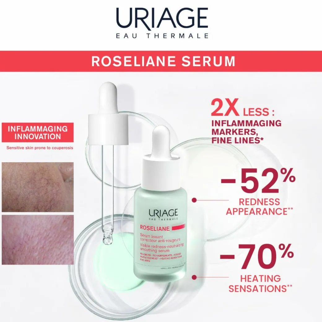 The new ROSELIANE Visible Redness-Neutralizing Smoothing Serum is the anti-inflammaging* solution for skin prone to couperosis. Anti-redness and anti-aging, it helps to prevent premature aging of sensitive skin thanks to 3 pharmacological molecules: hesperidin, enoxolone and niacinamide. 2X less redness, fine lines and heating sensations.