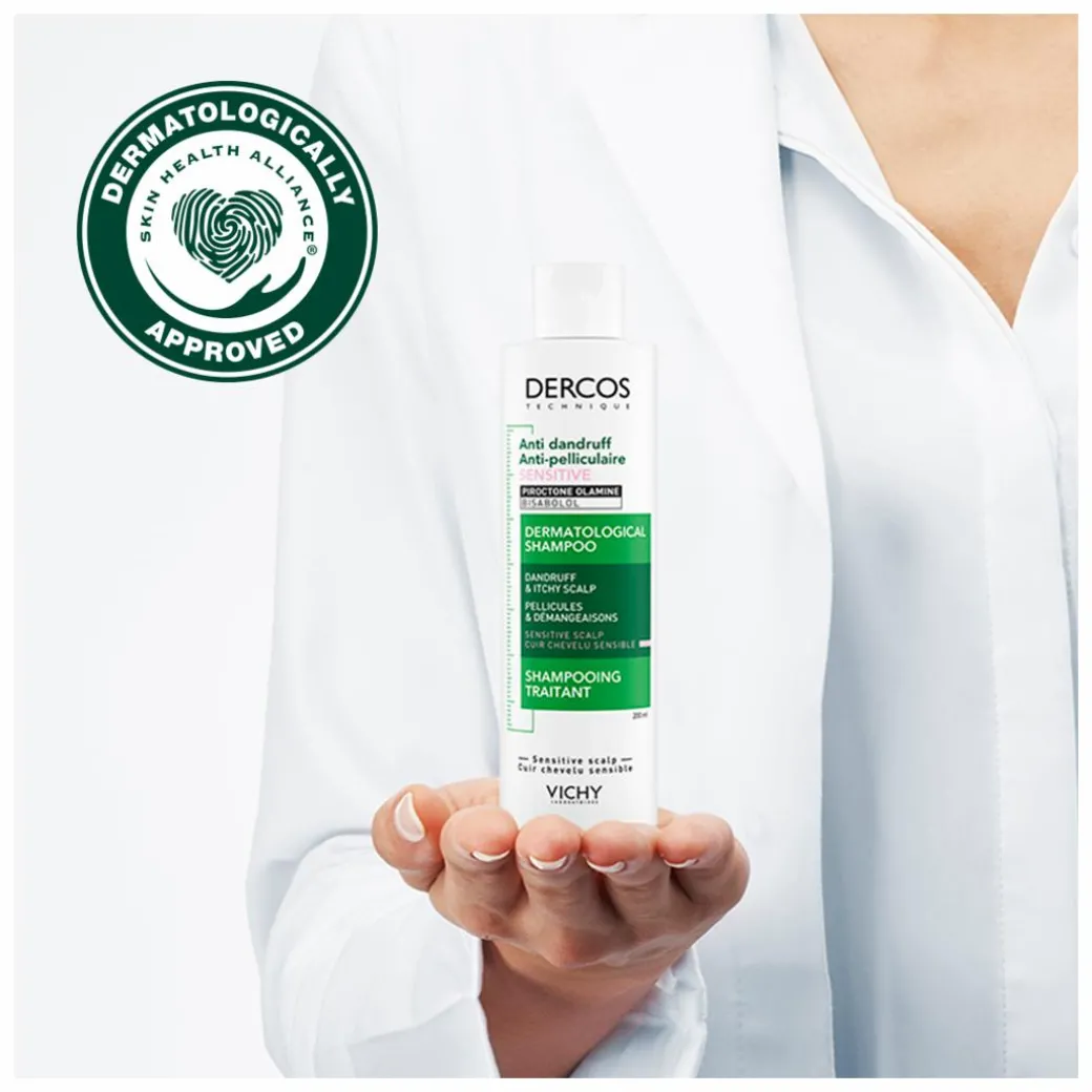 Vichy Dercos Anti-Dandruff for Sensitive Scalp is a Daily Shampoo formulated with Salicylic Acid, Piroctone Olamine and Bisabolol. This lightly scented formula is designed to help gently exfoliate the scalp and reduce discomfort and sensitivity. From the first use, visible flakes are removed and has a long-lasting 6-week anti-dandruff protection action*.
