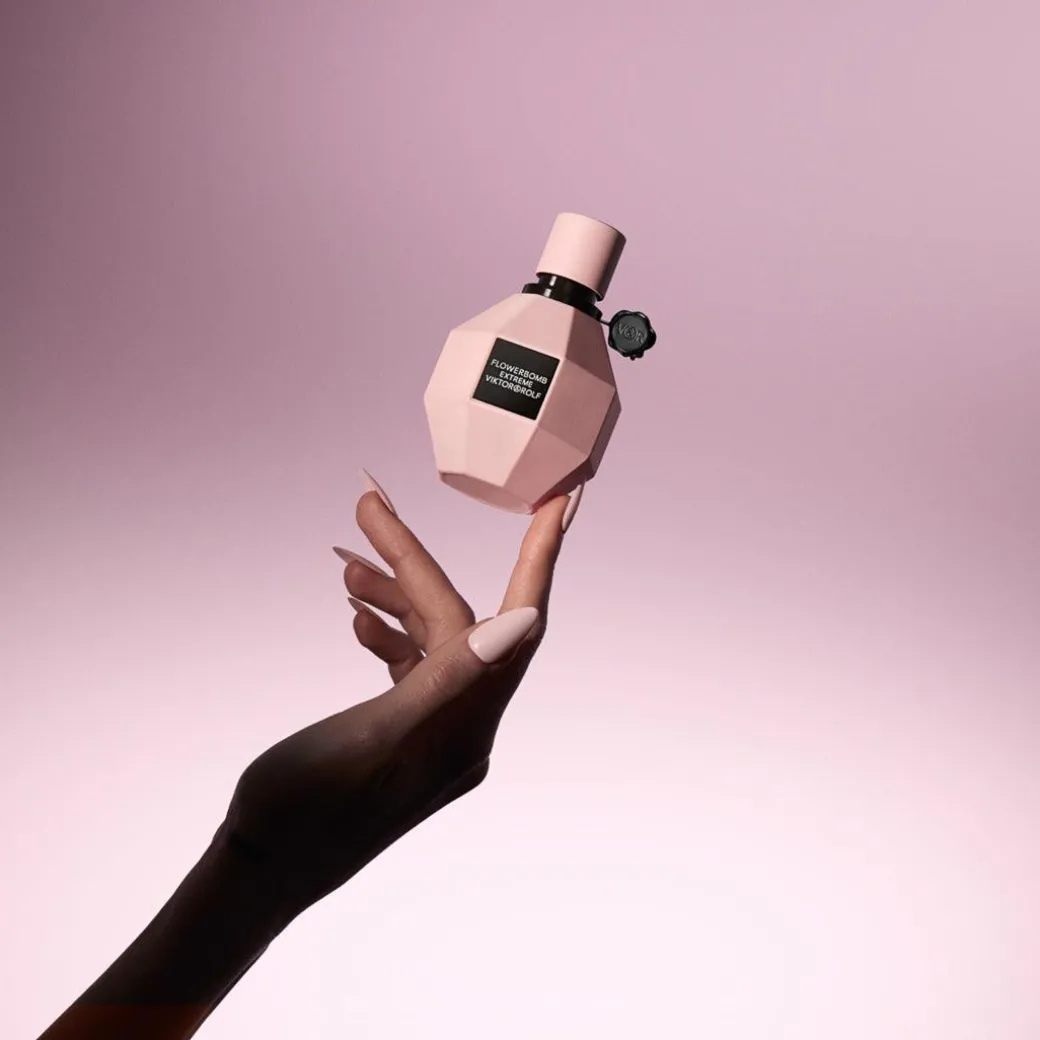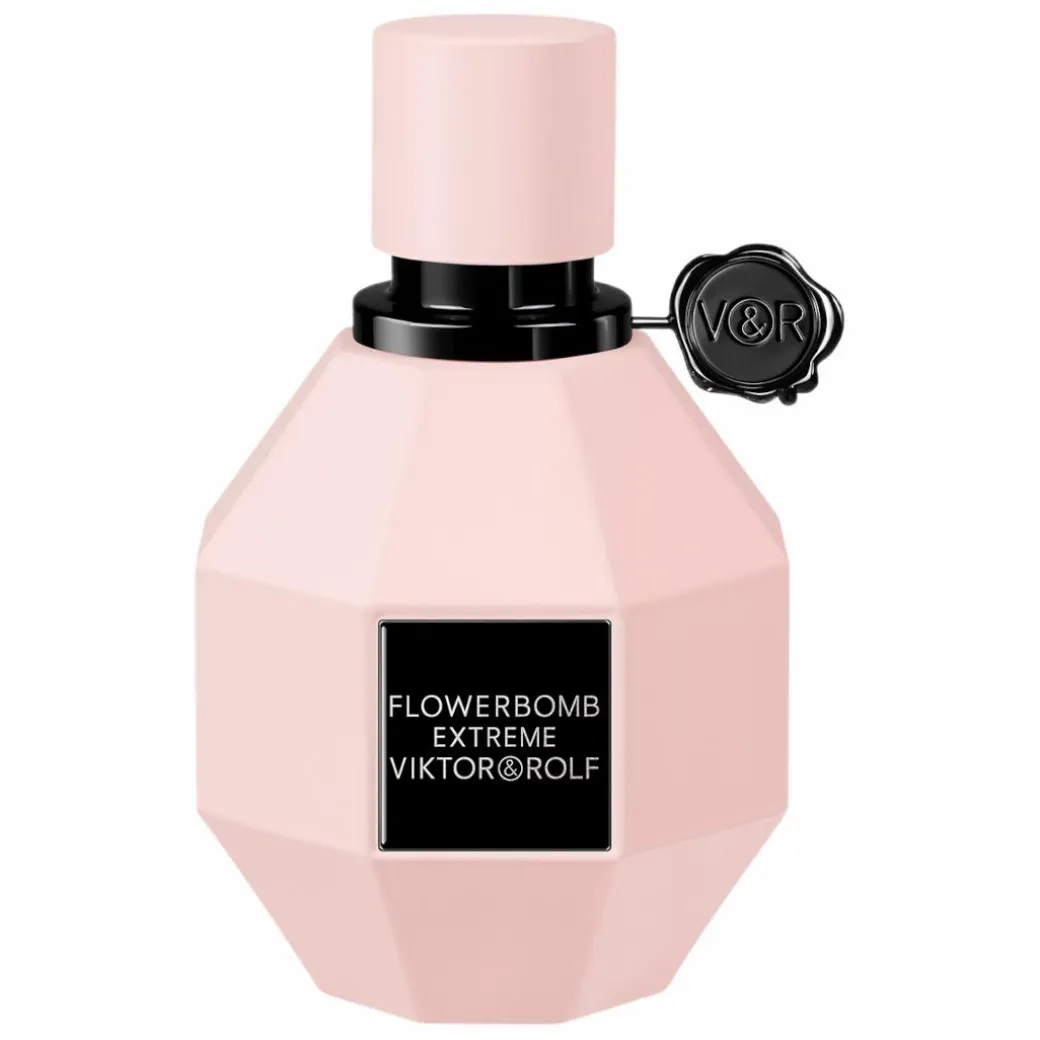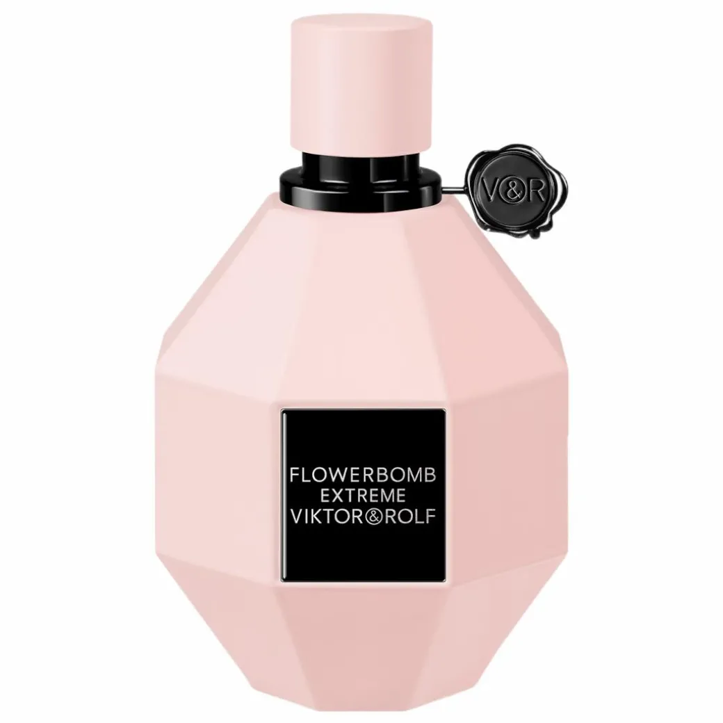 Viktor & Rolf revisited the iconic Flowerbomb bottle, pushed to overdose. Flowerbomb Extreme is the true quintessence of luxury. For such an unmatched and fearless floral explosion, the multi-faceted diamond-shaped bottle turns mat pink and is adorned with a bold, black Viktor&Rolf seal.